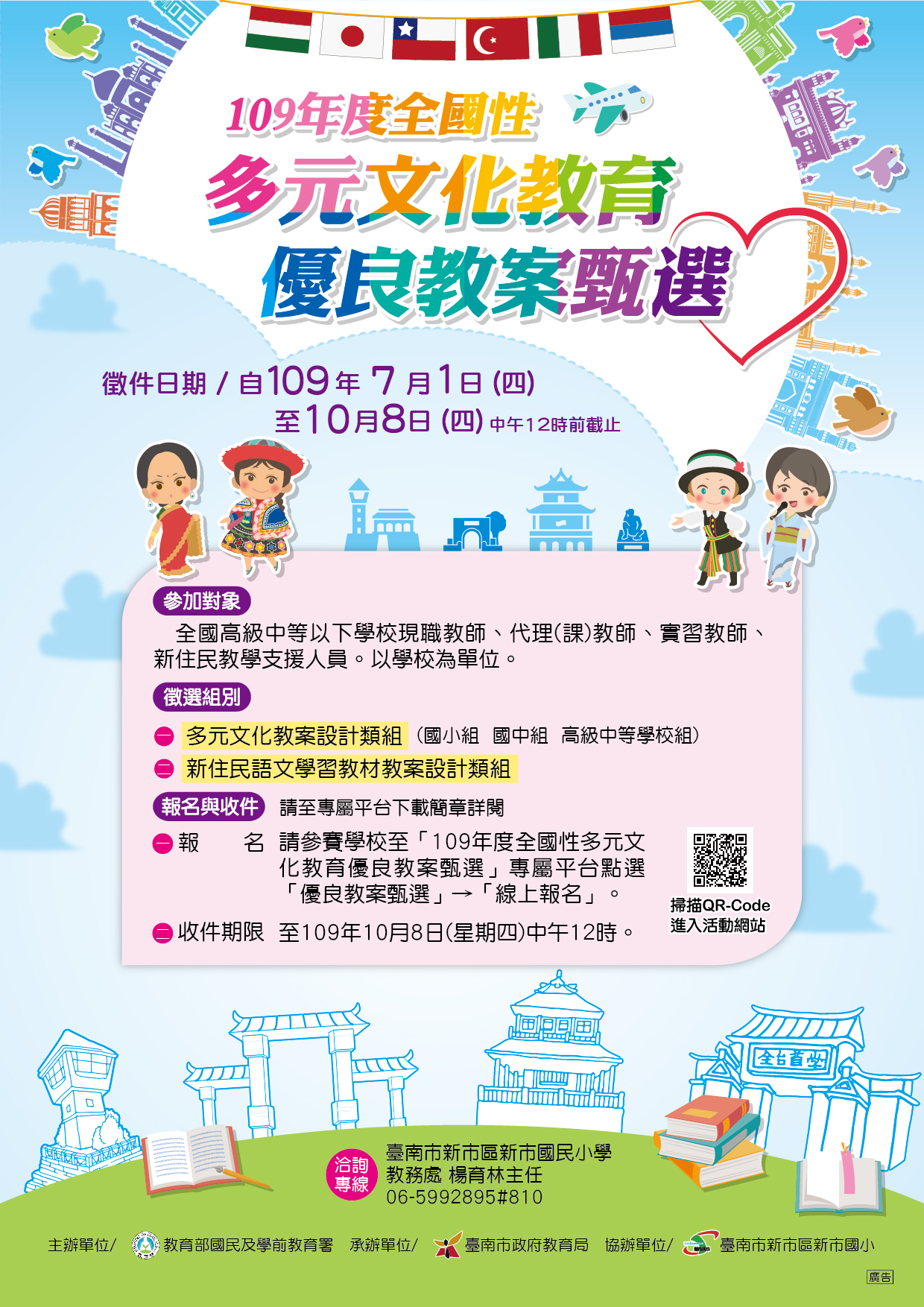 五、報名方式:請參賽學校至「109年度全國性多元文化教育優良教案甄選」專屬平台(https://newres.k12ea.gov.tw/competition)/「優良教案甄選」/「線上報名」進行線上報名。