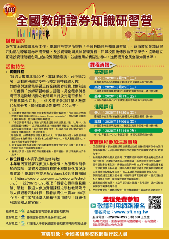 三、旨揭活動各場次自即日起至109年8月14日,全程免費參加,參與教師可獲得教師研習時數,詳情請至該基金會網站「全國教師證券知識研習營」專區查詢(網址為https://webline.sfi.org.tw/workshop/Default.asp?csn=460),洽詢電話02-23971222分機380王先生。