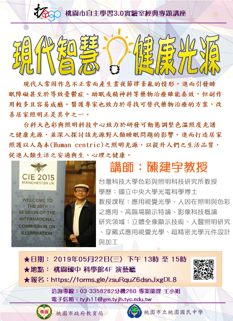 四、內容簡介:現代人因作息不正常而產生晝夜節律紊亂的情形,進而引發睡眠障礙甚至於導致憂鬱症。助眠或精神科等藥物治療雖能奏效,但副作用較多且容易成癮。醫護專家也致力於尋找可替代藥物治療的方案,改善居家照明正是其中之一。台科大色彩與照明科技中心致力於研發可動態調整色溫照度光譜之健康光源,並深入探討該光源對人類睡眠問題的影響。進而打造居家照護以人為本(Human centric)之照明光源,以提升人們之生活品質,促進人類生活之安適與生、心理之健康。