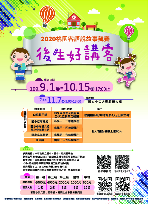 三、故事內容主題應以客家人文節慶、在地 傳說、校園 社區發展歷史等故事為主題, 鼓勵自創之故事,或其他自行取得授權使用(須於報名時加附故事文字稿) ,亦可參考客家委員會製作之「客語口說故事」(http://talk.hakka.gov.tw/)及本局製作之客語故事集(https://reurl.cc/ld9alv)。