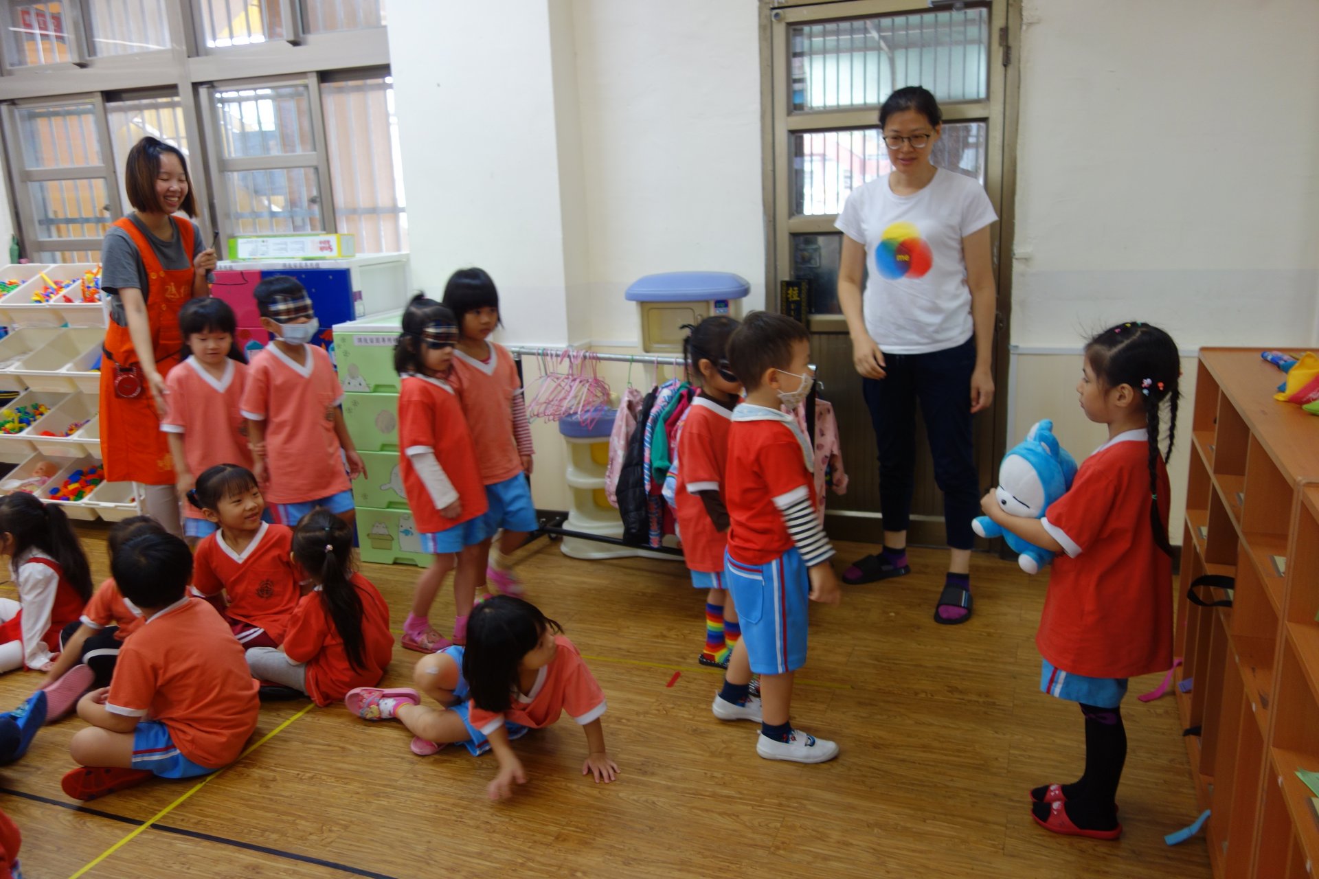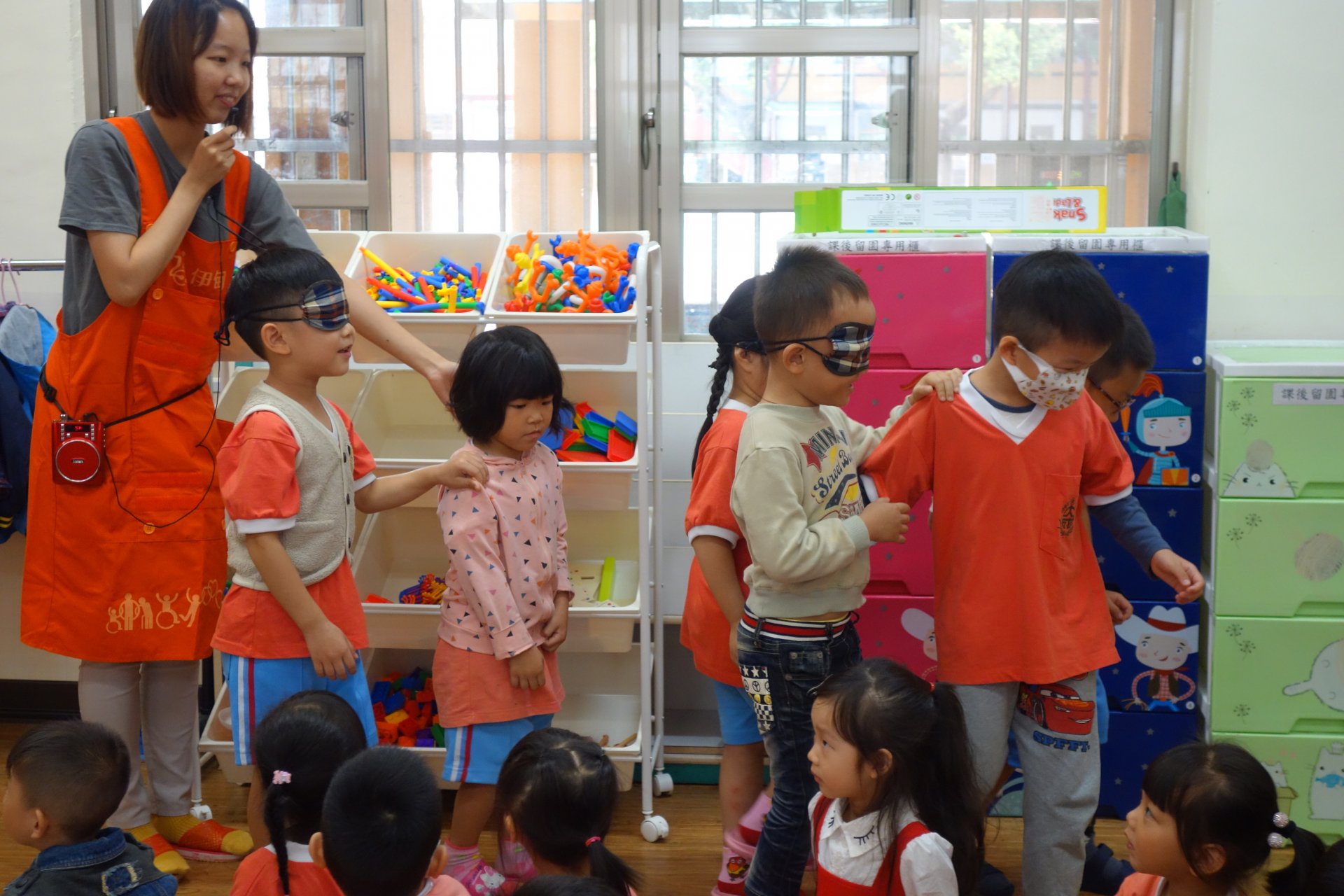 透過影片播放、討論以及實際互動體驗,讓寶貝們感受、體會身心障礙人士在面對生活的困難及不便,