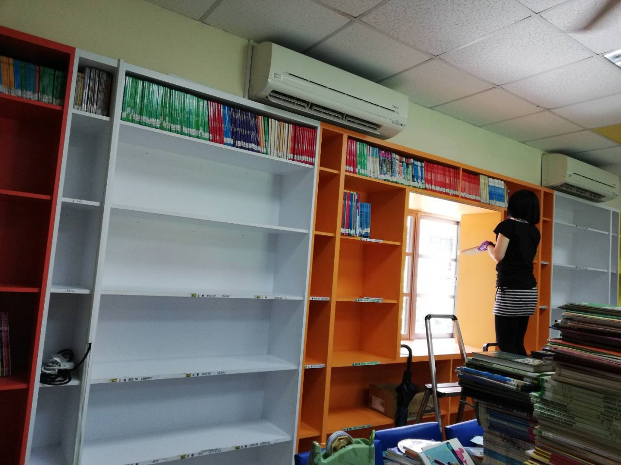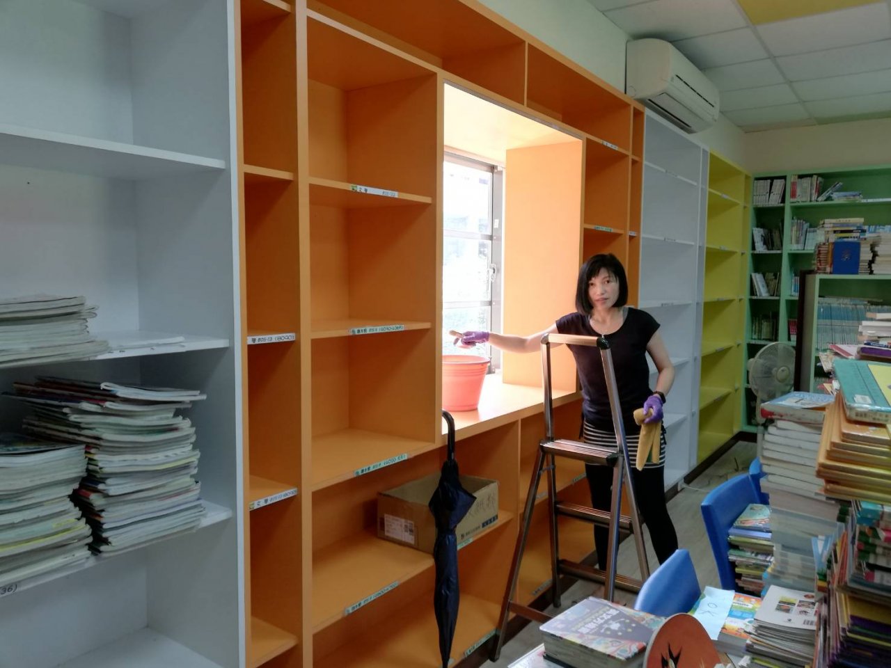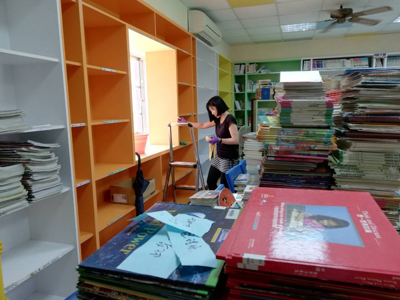 圖書館因為除蛀蟲蟲害工程,搬下整片牆的圖書,6/24上午和支援同仁倾麗小姐清掃後,兩人慢慢上架,1.5小時進度慢,但會漸入佳境,急需人手協助!!!