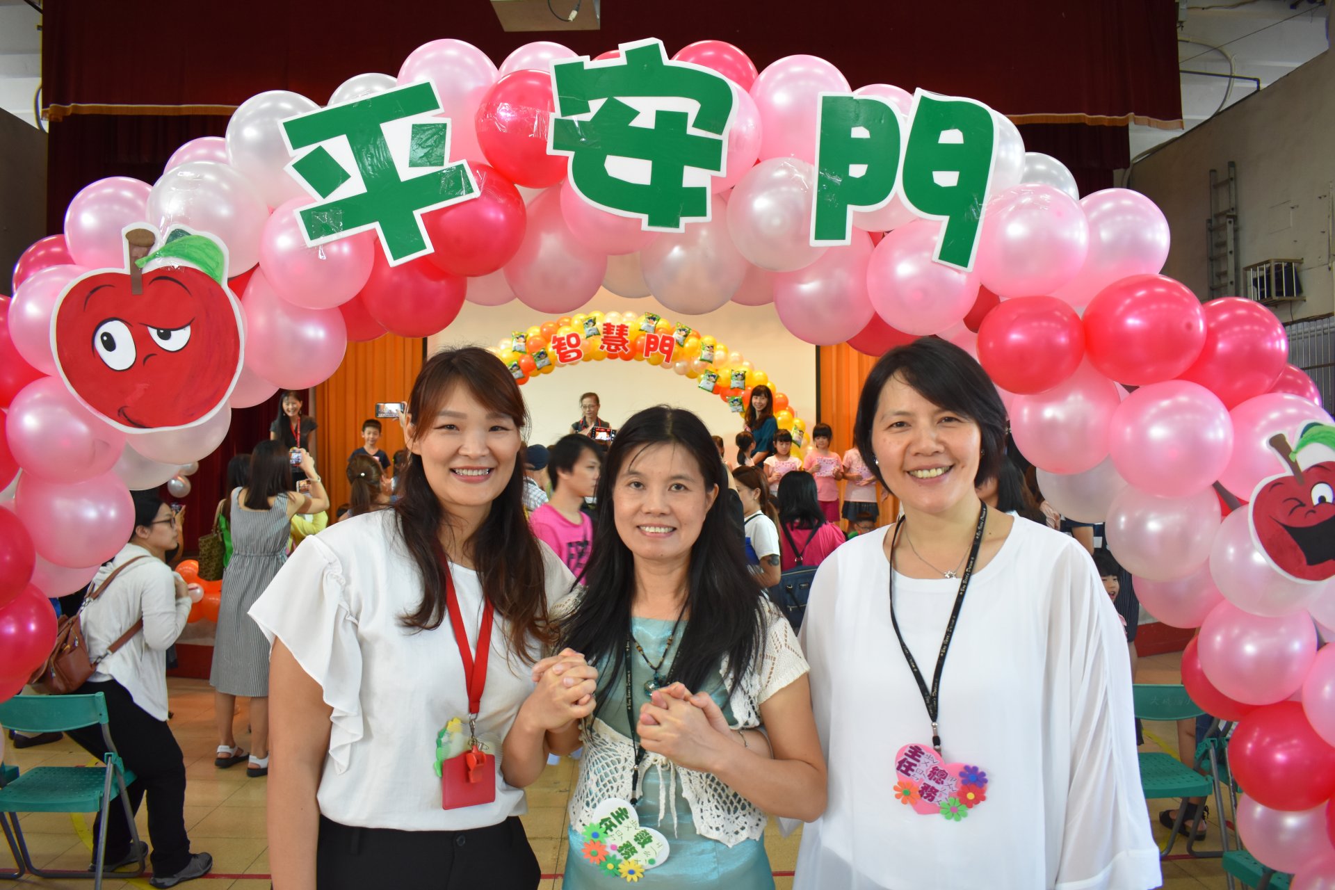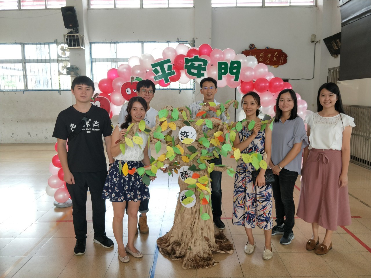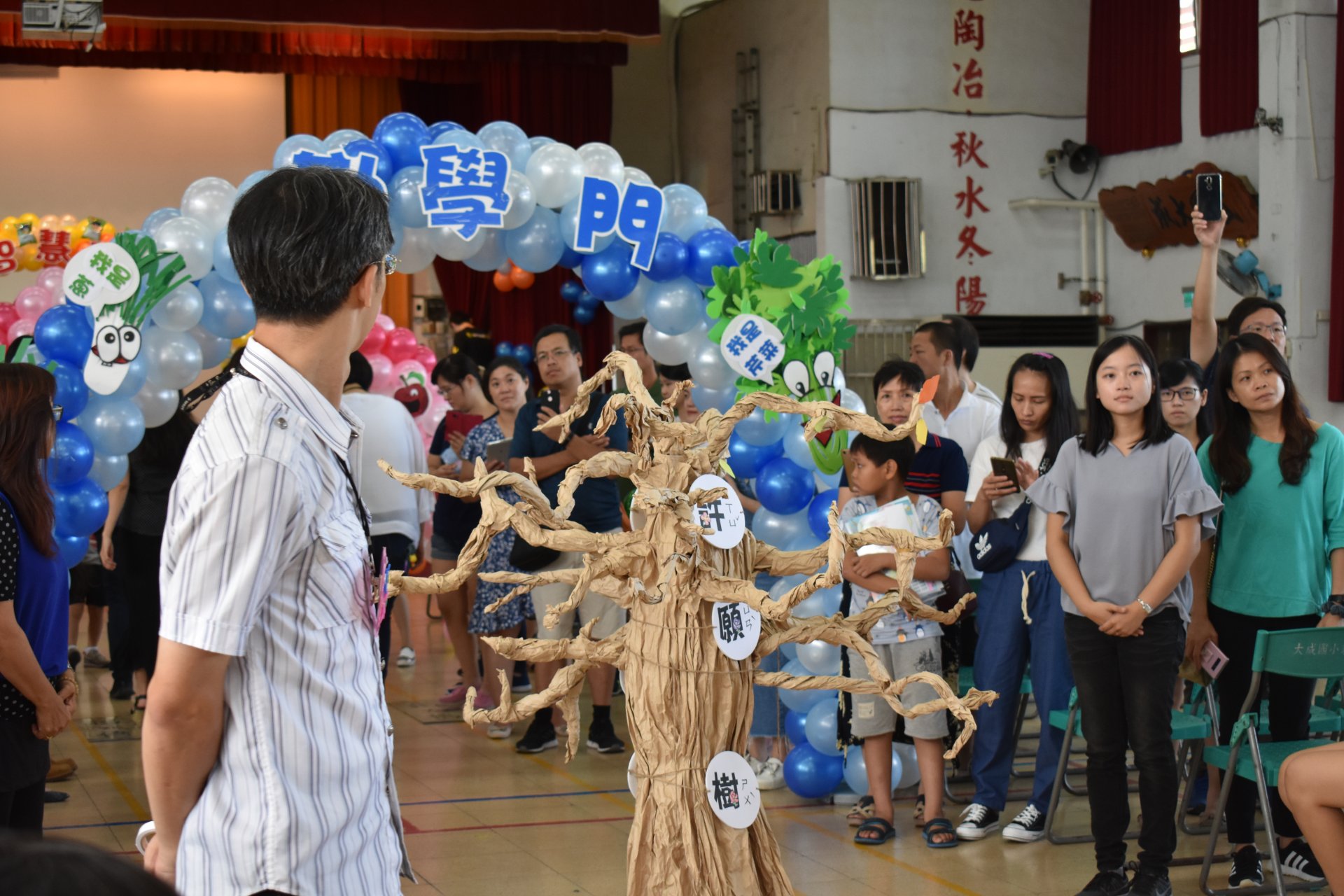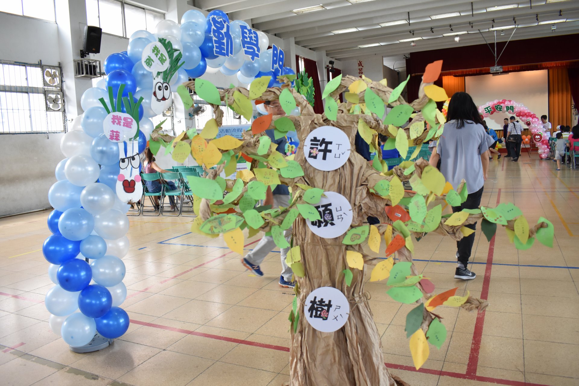 活動一開始,所有新生貼上在教室先寫好的許願樹葉卡,然後貼在精心設計的許願樹上,之後通過勤學門成為大成人。(芹菜、蔥、蒜氣球拱門,象徵『跨越勤學之門,進入大成之家』),接著頭頂西瓜造型海灘球走過巧拼獨木橋(巧拼獨木橋象徵『獨立自主』,頭頂西瓜『頂呱呱』) 。最後穿越「平安門」(蘋果氣球拱門,象徵『平平安安、健康快樂』)。新生再敲響「勇氣鼓」,在智慧門前,校長與會長贈送新生智慧福袋。