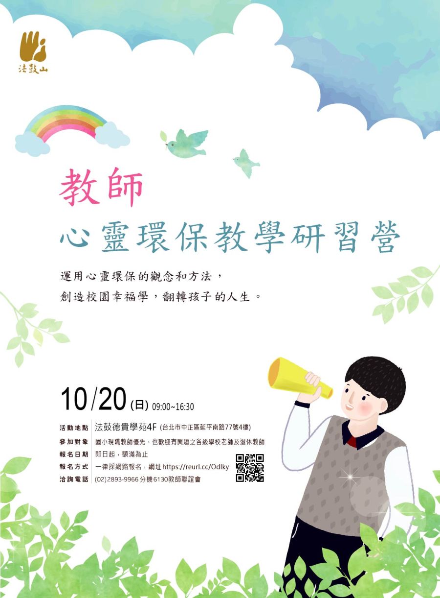 說明: 一、研習目的: (一)運用心靈環保精神與方法,融入各領域教學。 (二)以心靈環保的理念,建立和諧尊重的校園倫理。 (三)強化生命教育及品德修養,營造?馨清淨的校園。 (四)透過班級經營與實務交流,讓師生互動良善,提昇教學效能。 二、時間:108年10月20日(星期日)上午9:00~下午4:30。 三、地點:法鼓德貴學苑412教室(地址:台北市中正區延平南路77號4樓)。 四、檢附旨揭活動簡章和電子海報各1份供參。