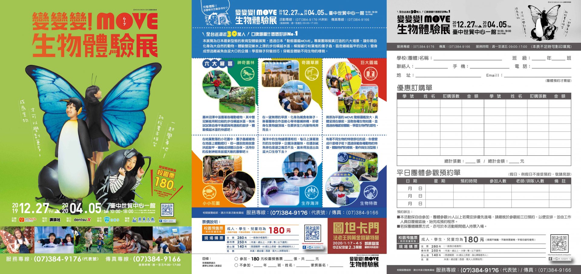 三、檢送本展展覽資訊,敬請惠予協助公告轉知相關資訊並請鼓勵作為校外教學參考之依據。相關優惠預購詳情,請洽活動推廣部服務專線:(07)384-9176(代表號)、傳真:(07)384-9166。