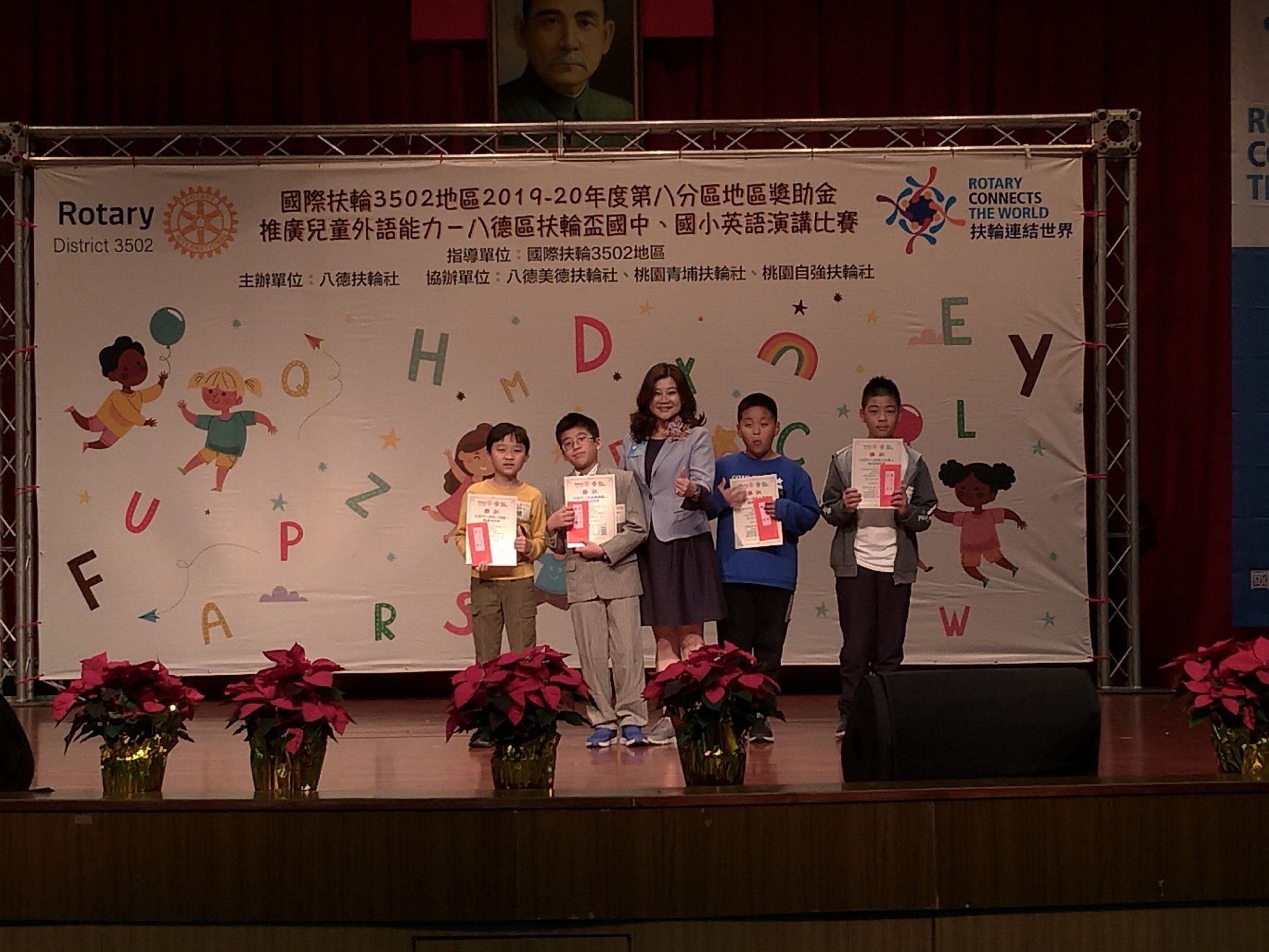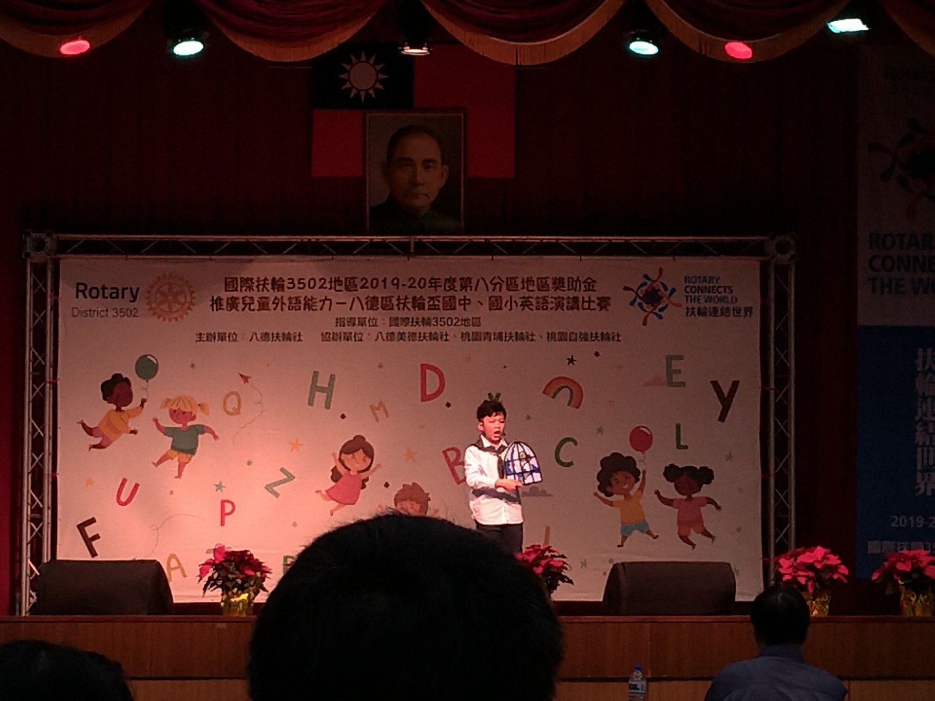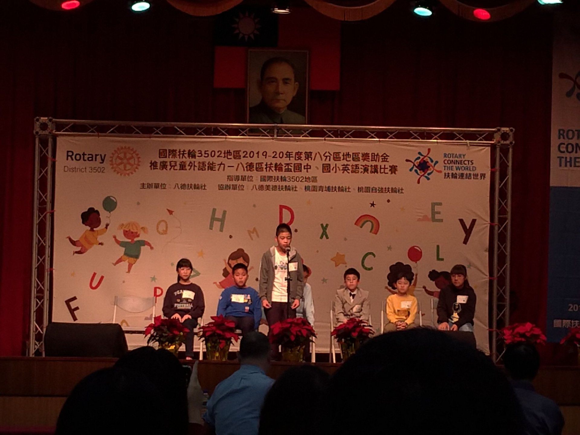 八德扶輪社於108/12/15(日)大忠國小舉辦一年一度的英語演講比賽,本校510班張哲銘同學參加高年級拼字比賽、409班徐弘軒同學參加中年級說故事比賽。今年賽制與往年不同,兩位同學與指導老師們也悉心準備多日,在這日有了完美的結果。