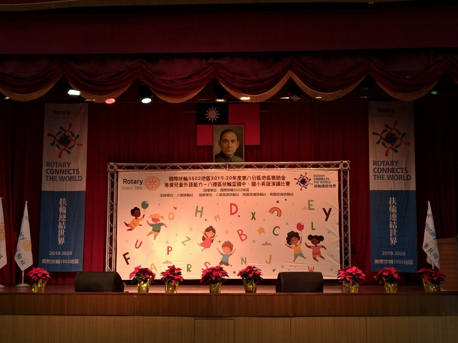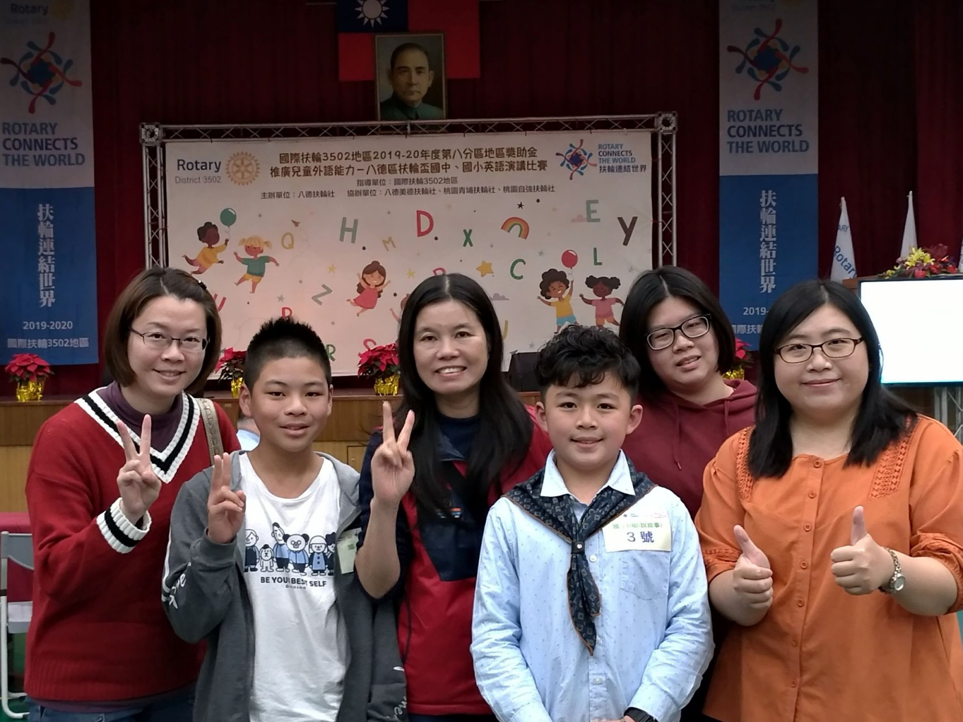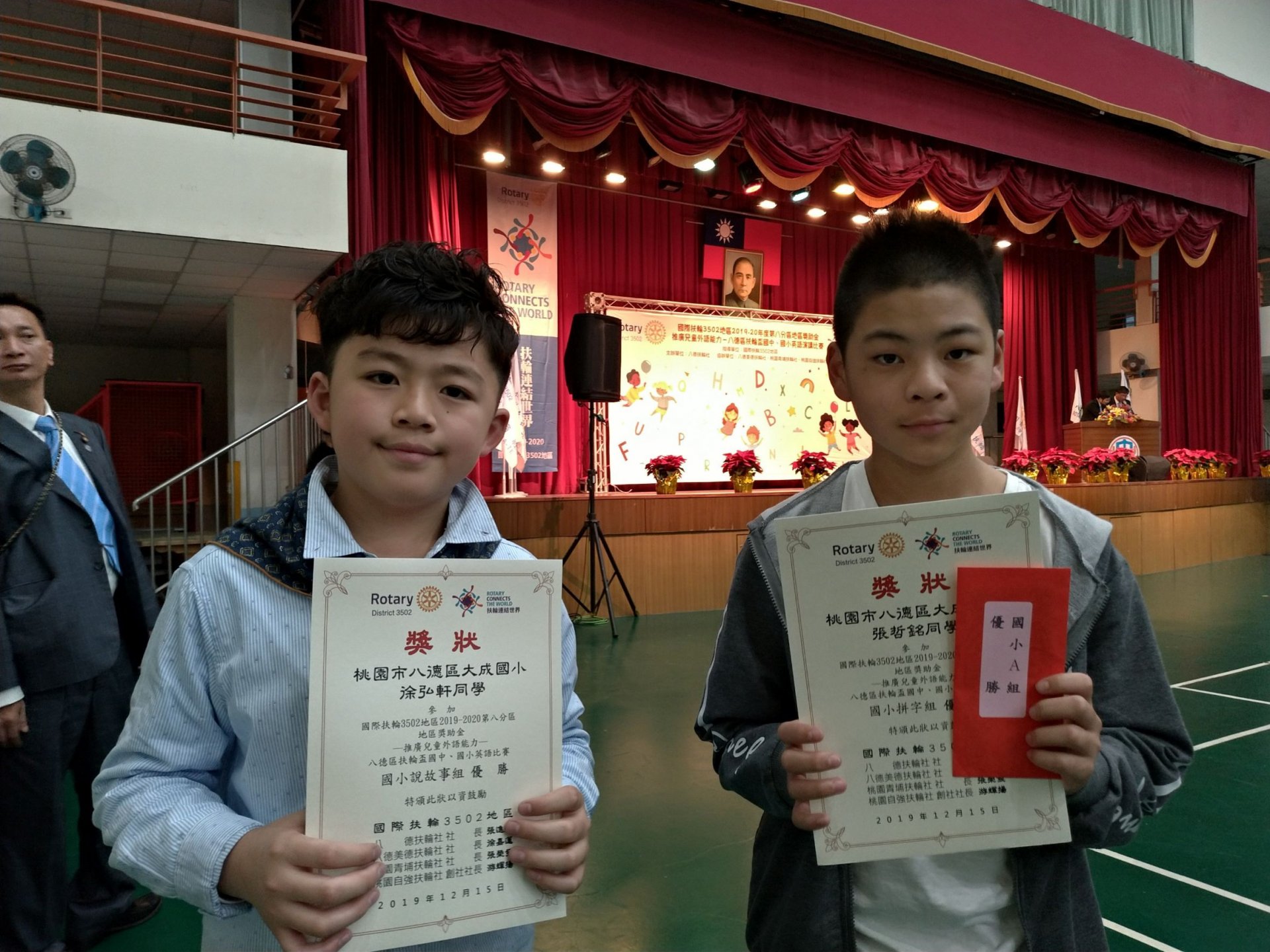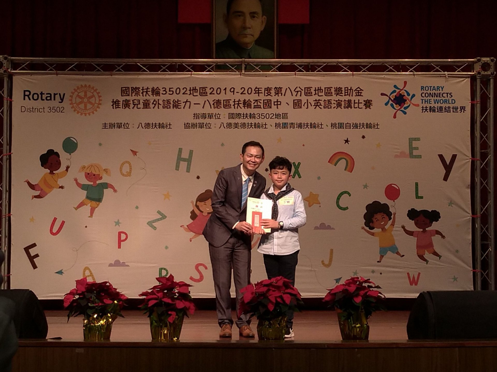 八德扶輪社於108/12/15(日)大忠國小舉辦一年一度的英語演講比賽,本校510班張哲銘同學參加高年級拼字比賽、409班徐弘軒同學參加中年級說故事比賽。今年賽制與往年不同,兩位同學與指導老師們也悉心準備多日,在這日有了完美的結果。