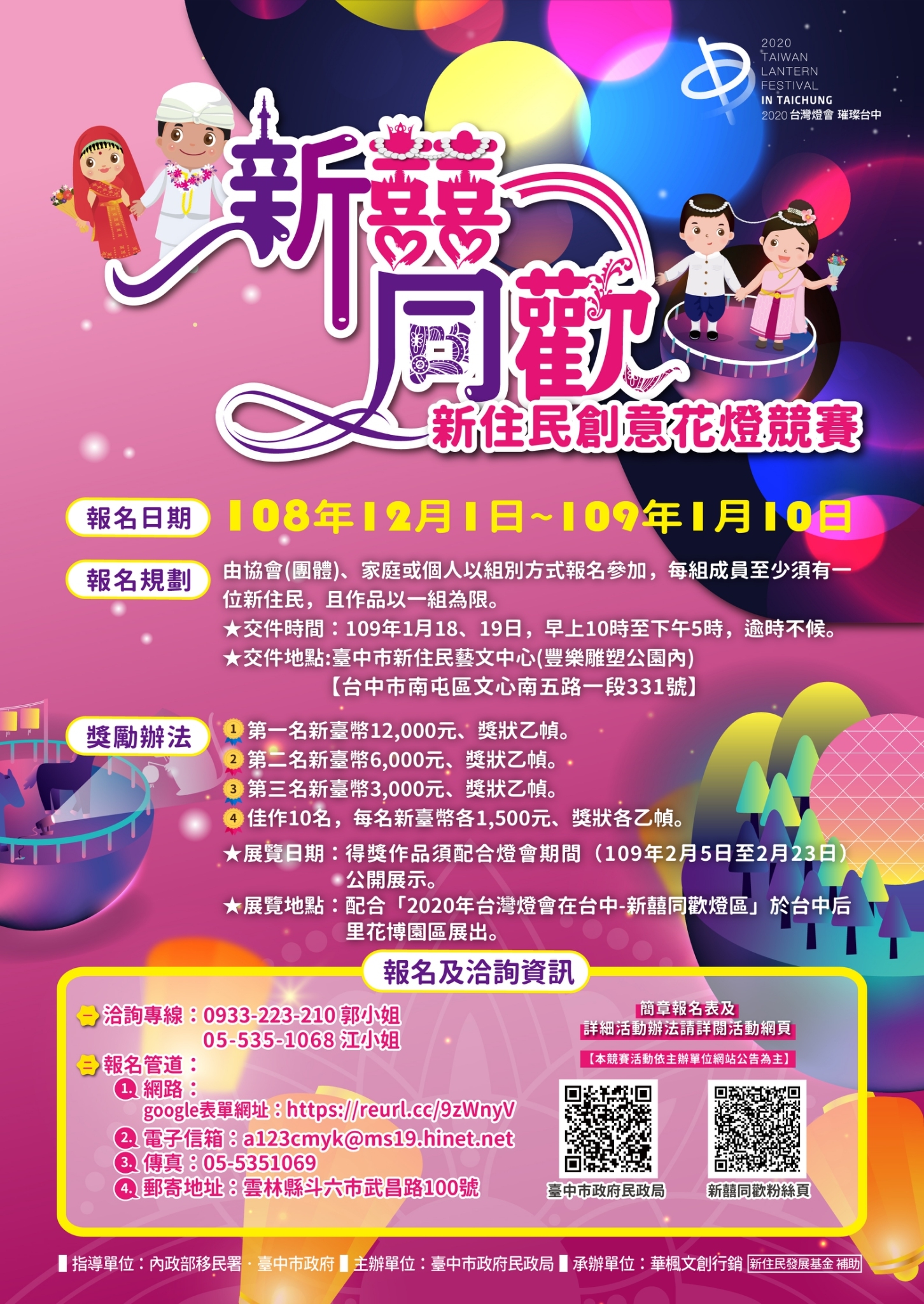 二、2020台灣燈會在台中-新囍同歡燈區之設置,係為呈現我國對新住民之重視,希冀透過競賽舞台,展現新住民長才,傳遞多元文化之美。