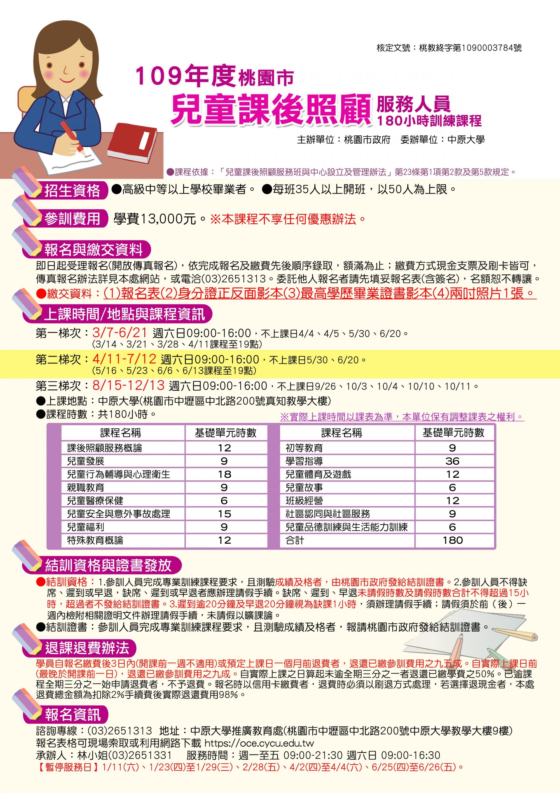 說明: 一、旨揭課程第二梯次(假日班):4月11日至7月12日;第三梯次(假日班):8月15日至12月13日。 二、課程簡章及報名表如附件,或至本校推廣教育處網站查閱下載,網址:https://bit.ly/2UhJdL4。 三、每班限額50名。 四、相關事宜請洽推廣教育處,電話:03-2651313。
