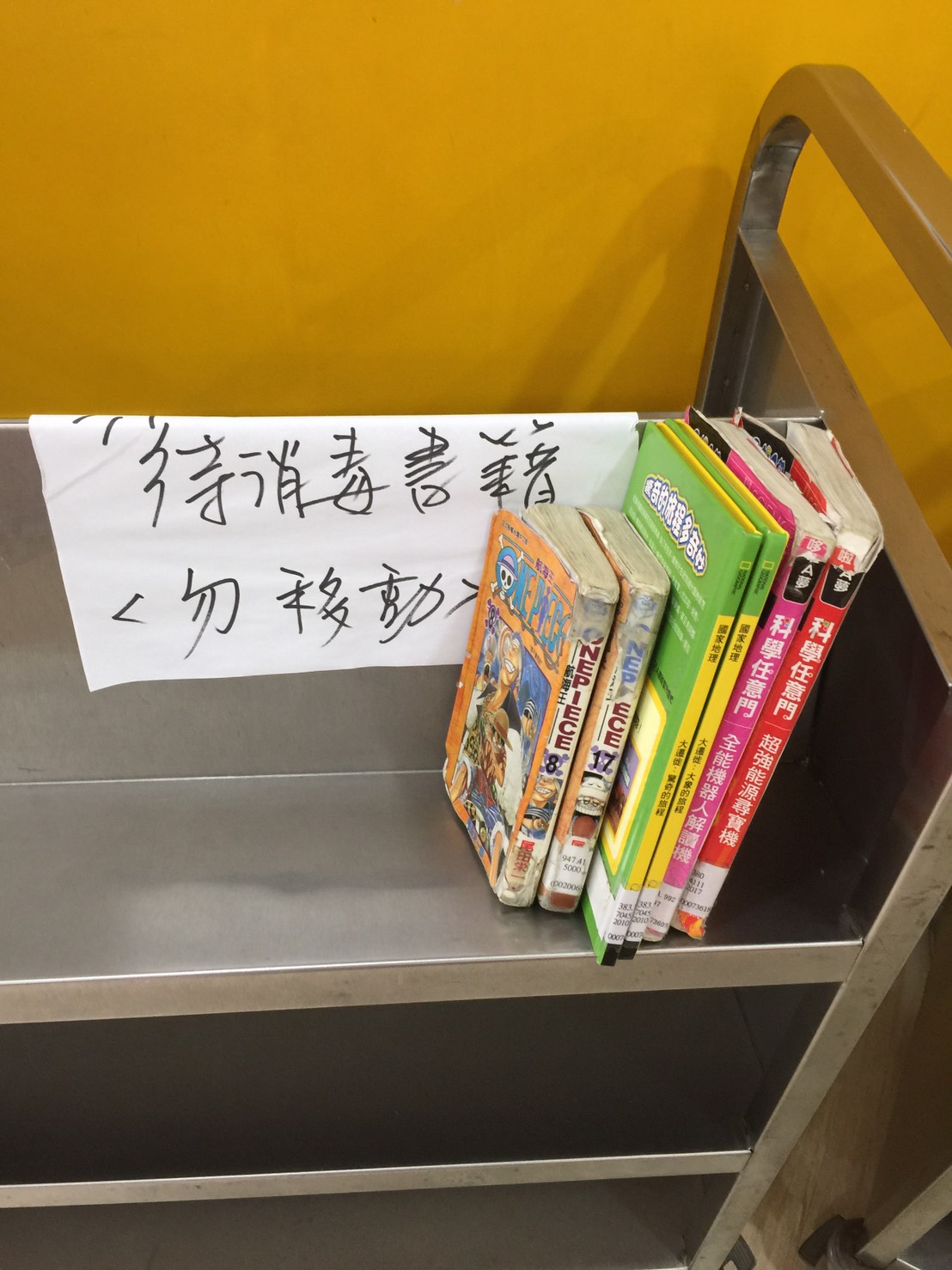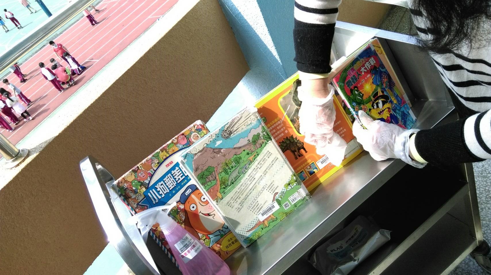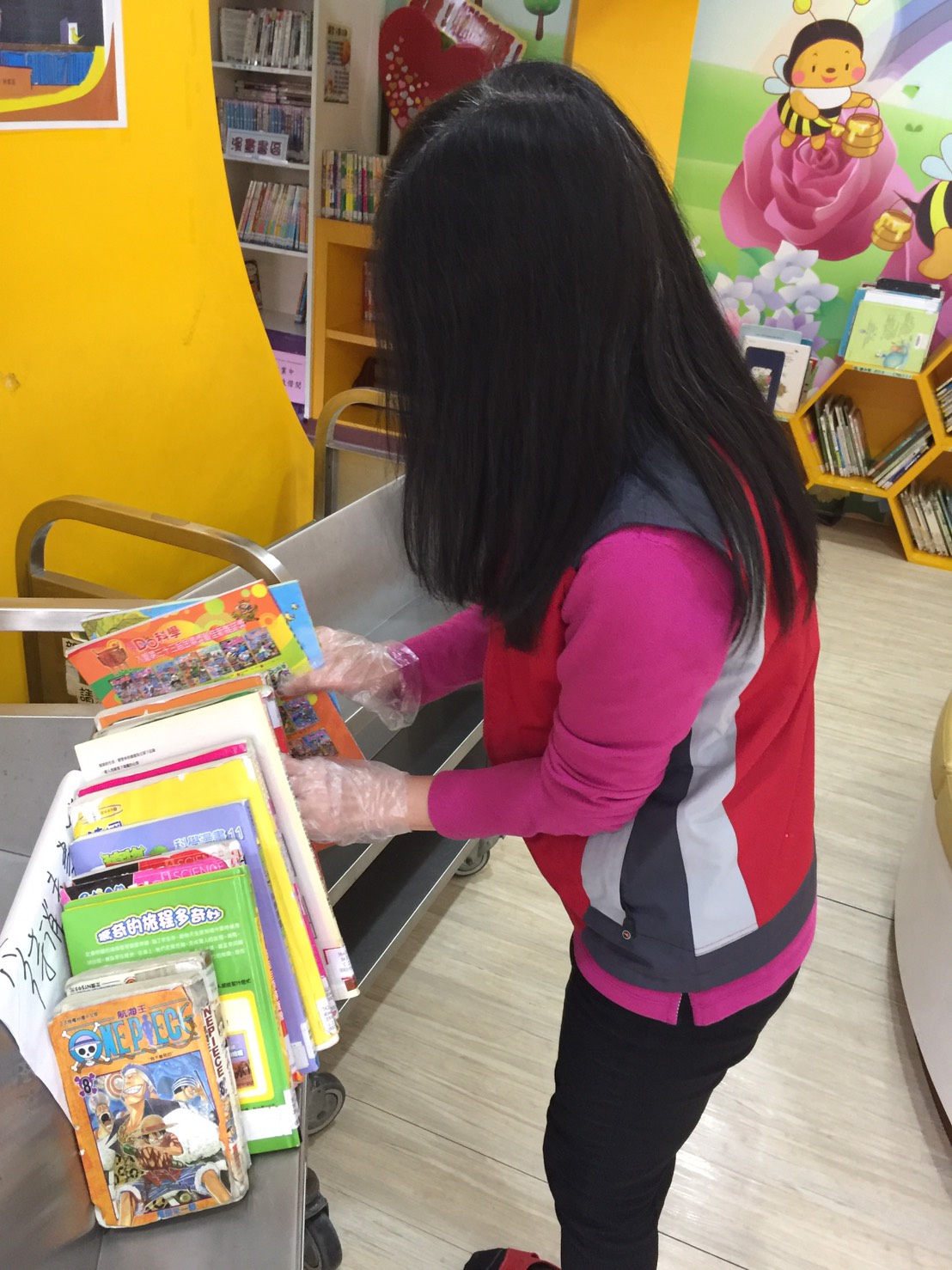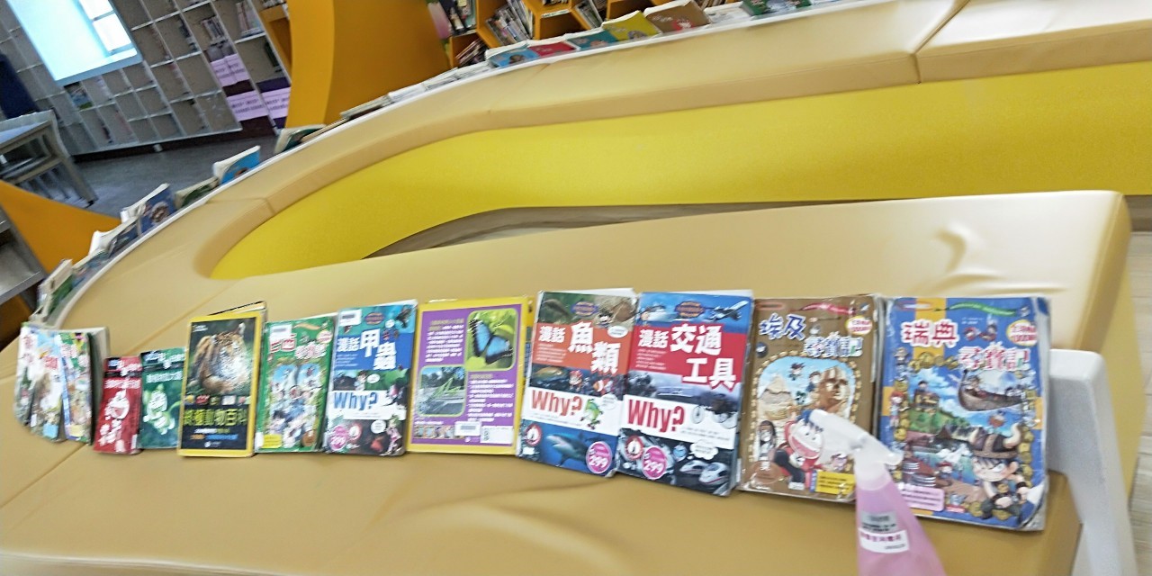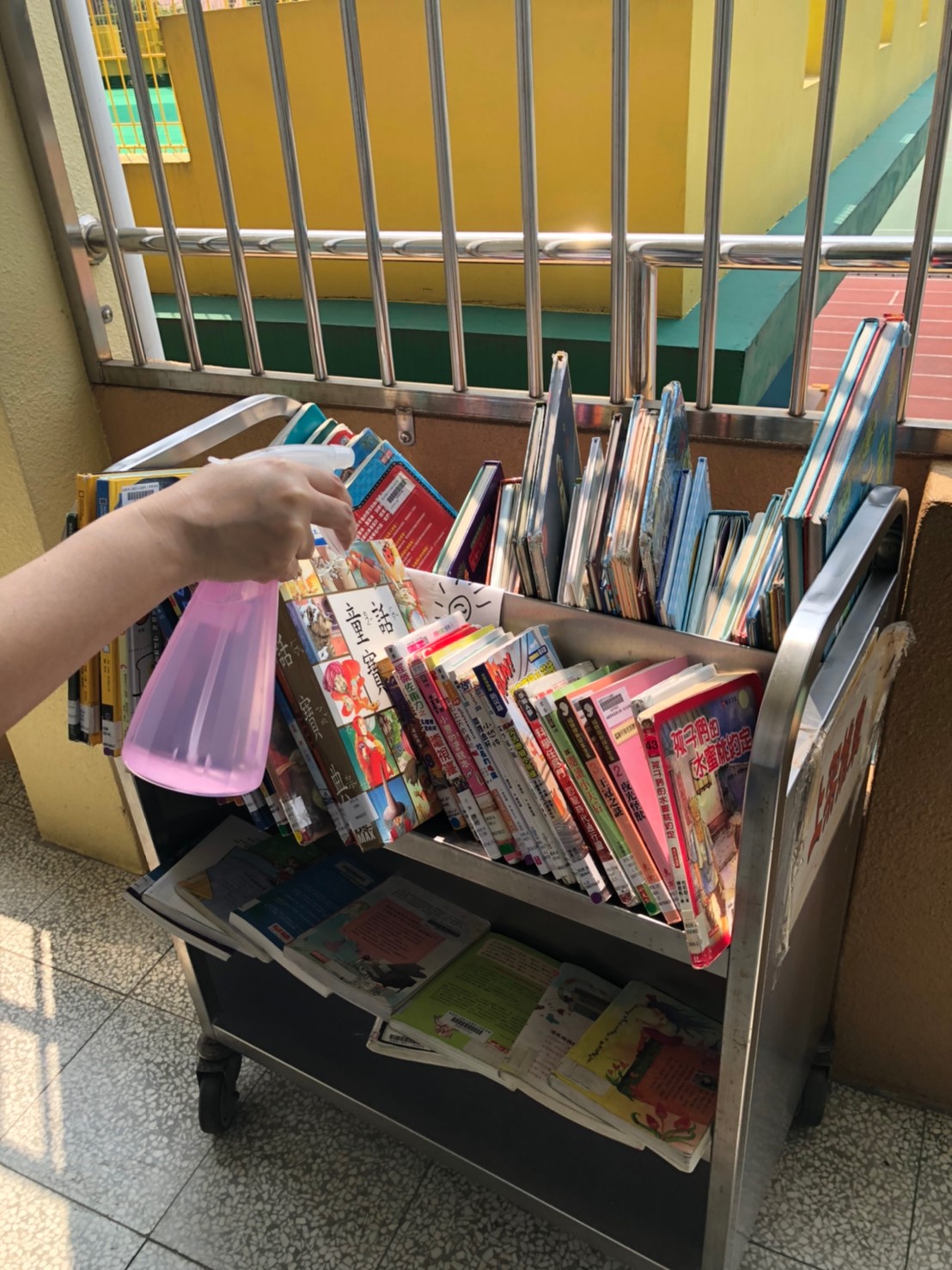 - 書車上有歸還書籍,請噴酒精消毒,若有陽光,可將書車及書本推出去曝曬殺菌,稍後才依原點標籤或分類號上架歸位。