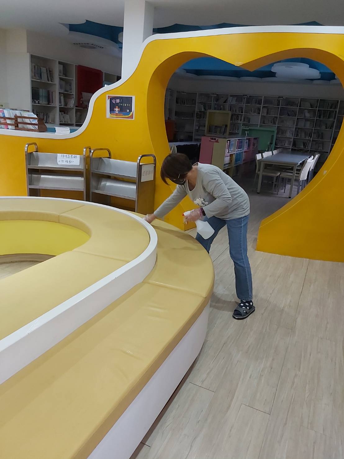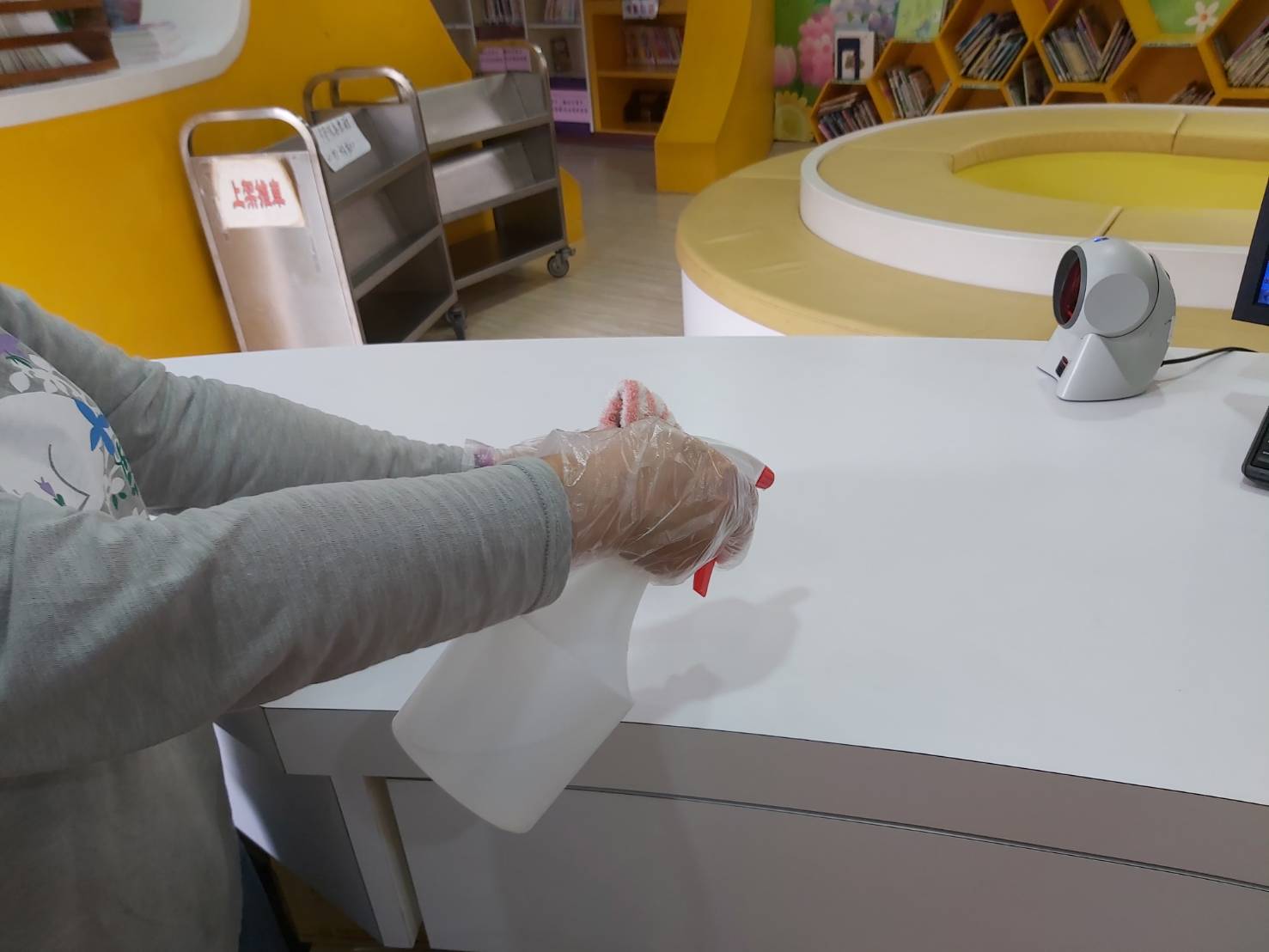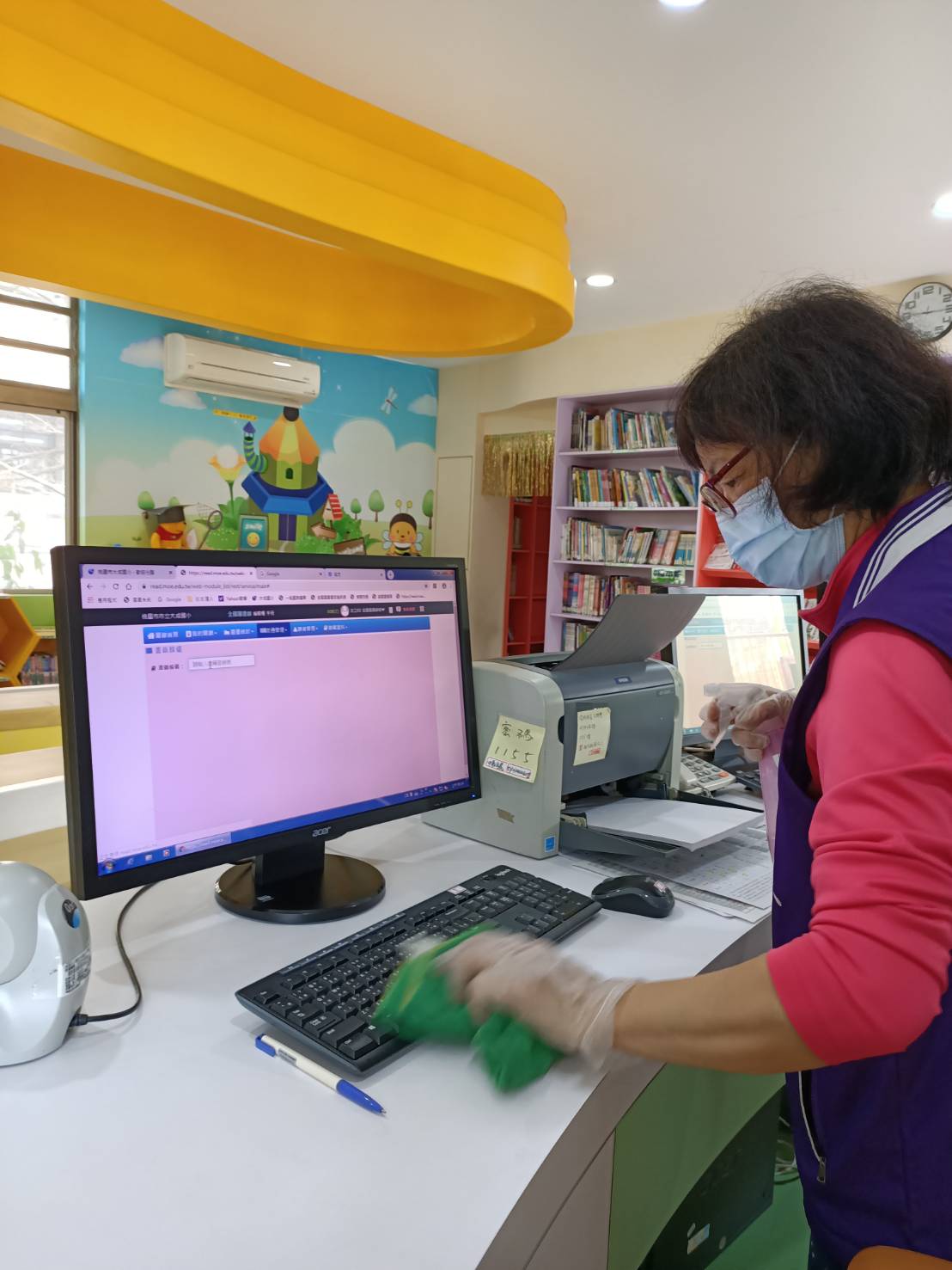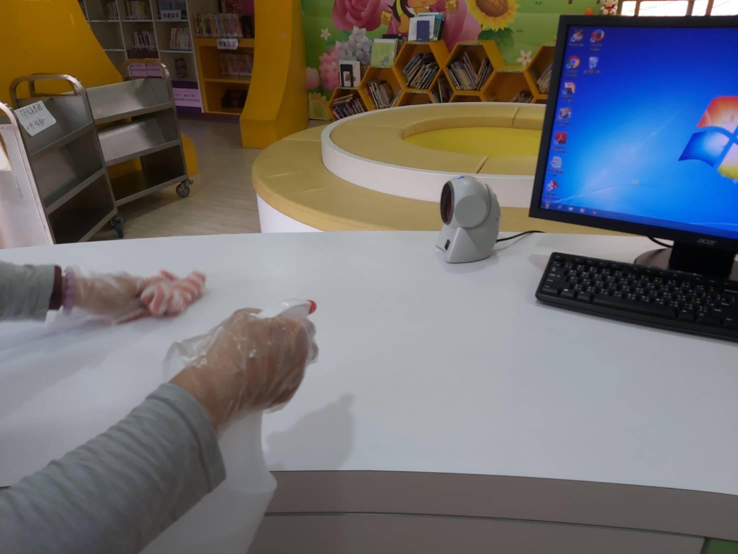 1. 請志工協助用稀釋漂白水擦拭櫃台,電腦鍵盤以乾淨乾布拂塵。