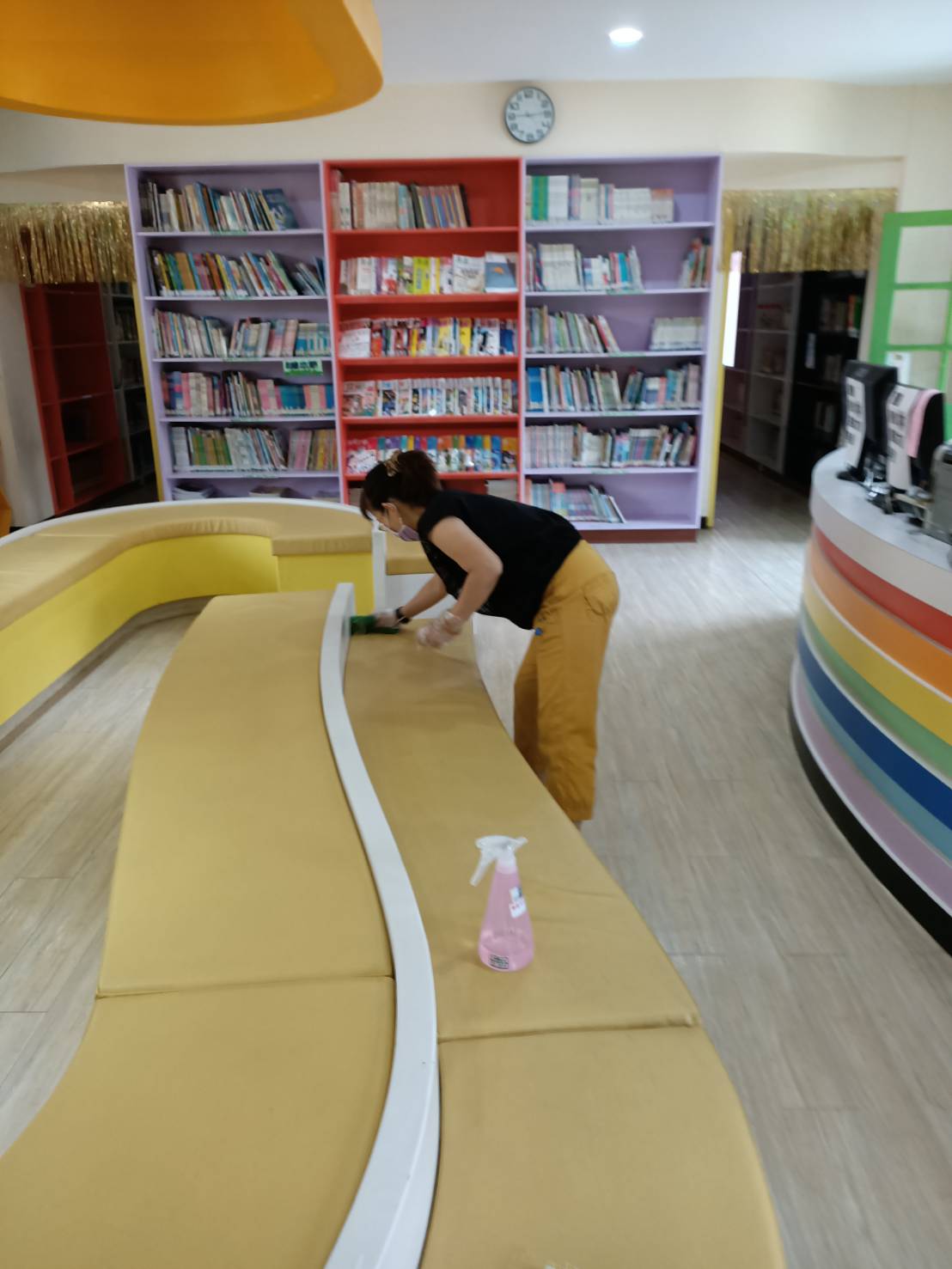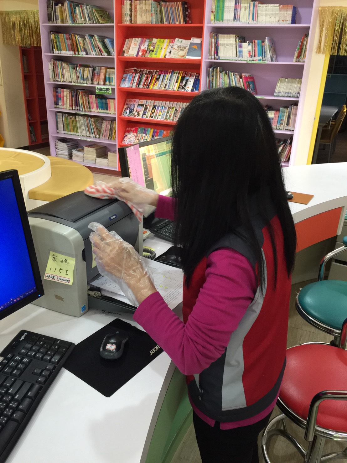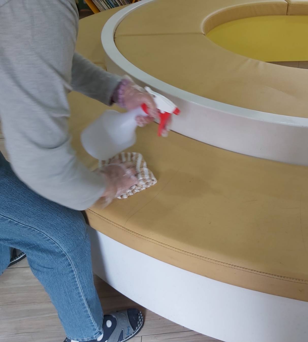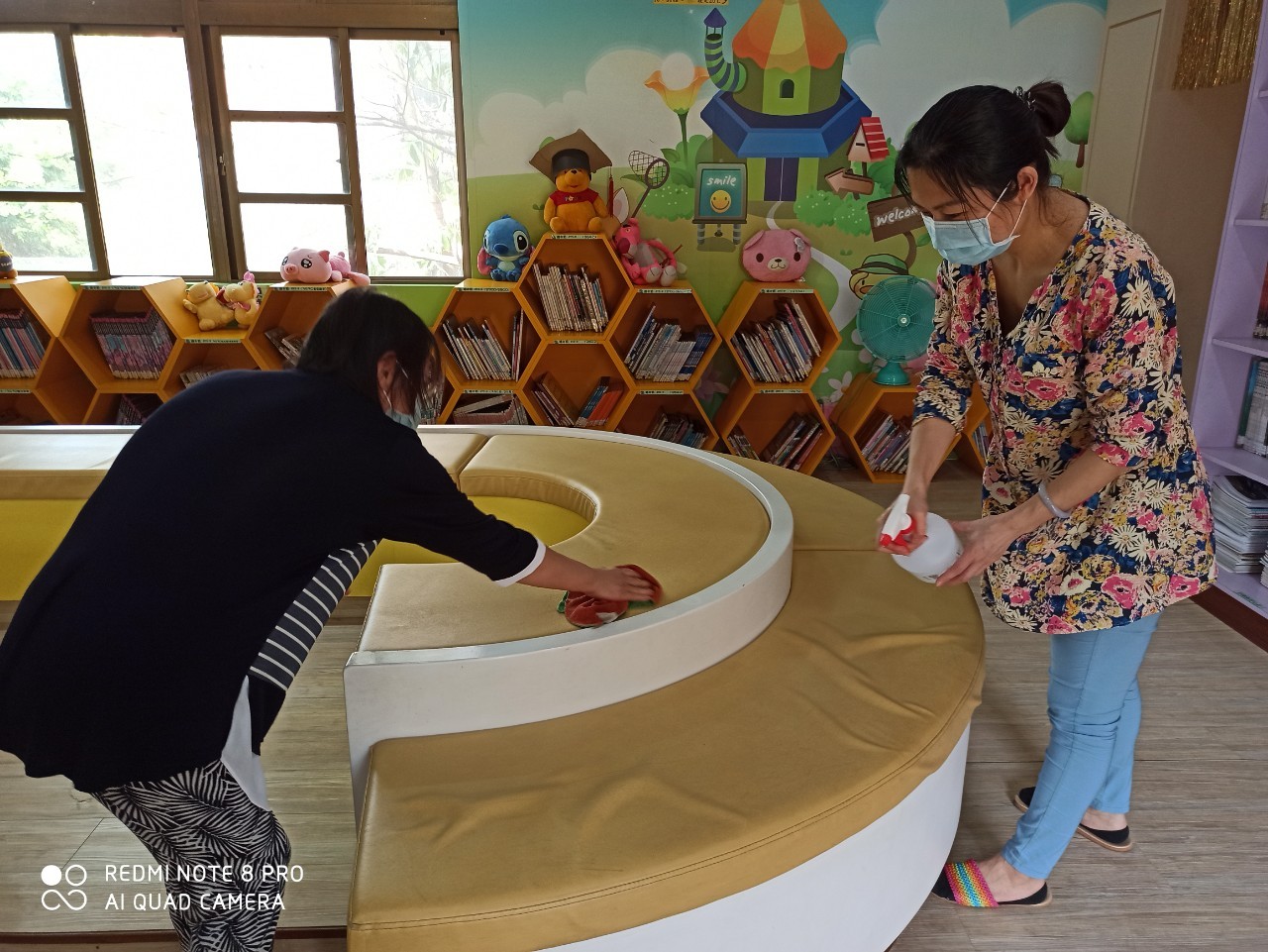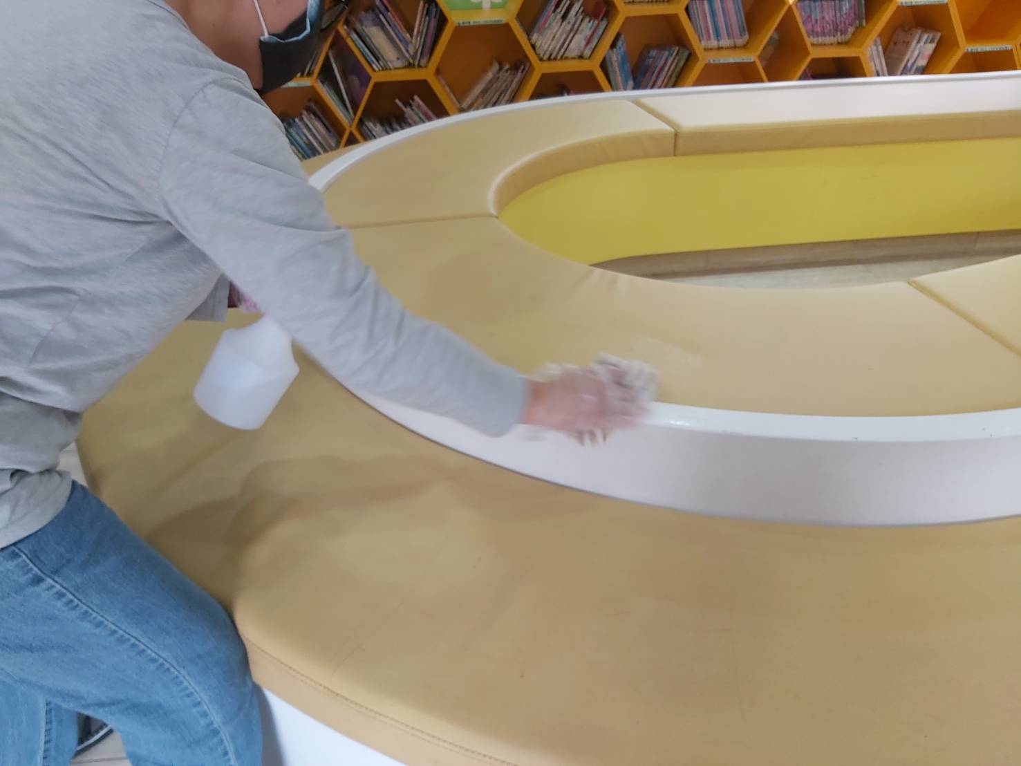 1. 請志工協助用稀釋漂白水擦拭櫃台,電腦鍵盤以乾淨乾布拂塵。