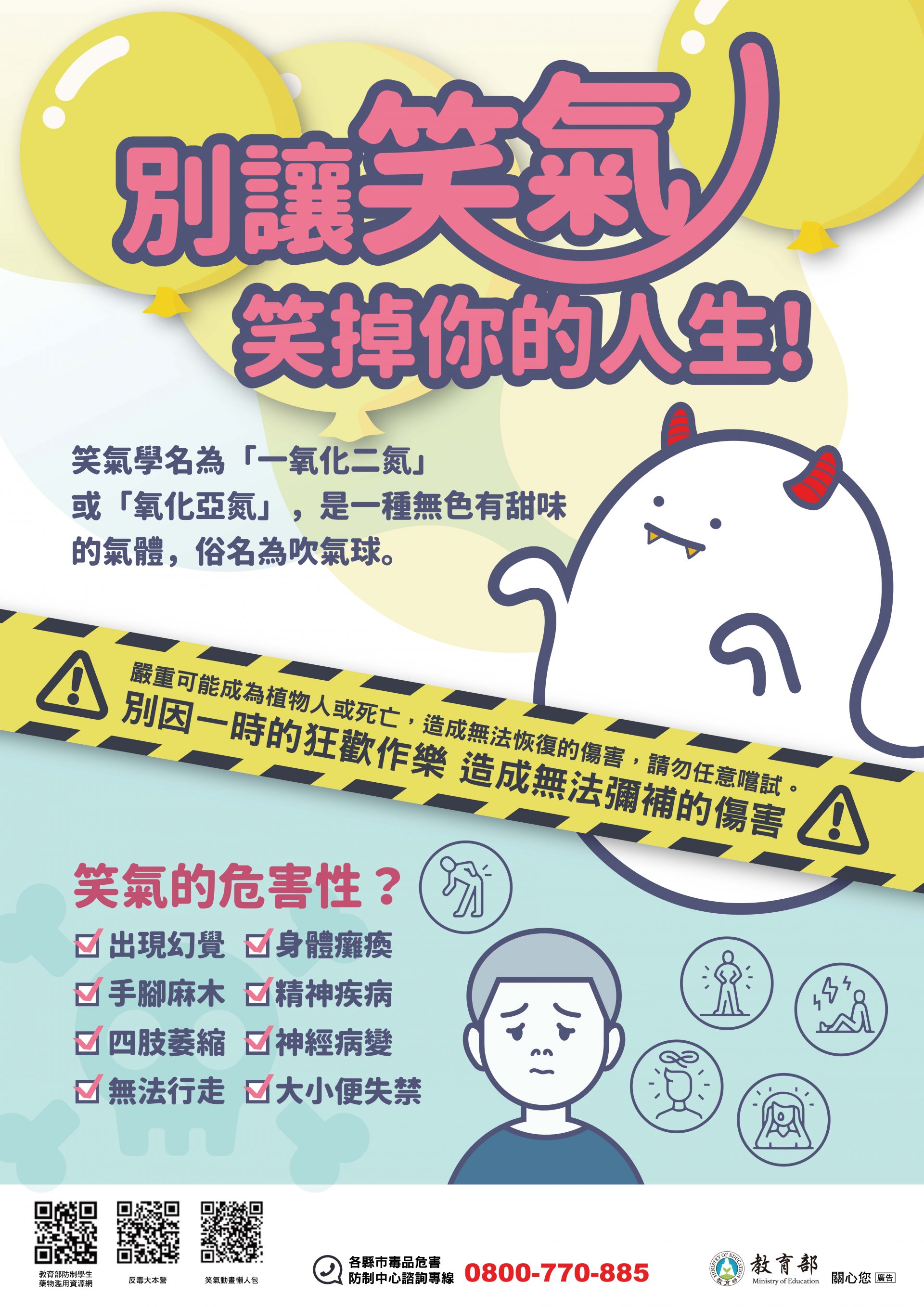 為宣導笑氣(氧化亞氮)之危害性,教育部製作文宣海報1款,請協助強化宣導家長及一般民眾相關資訊,並可結合各項活動共同宣導,歡迎多加利用。 如有相關活動宣導需求,請至教育部「防制學生藥物濫用資源網」之文宣專區(網址:http://enc.moe.edu.tw/Poster/View/214),下載電子檔運用。 教育部業已製作「笑氣動畫懶人包」,請至教育部「防制學生藥物濫用資源網」之影音專區(網址:http://enc.moe.edu.tw/VideoList)參考運用。