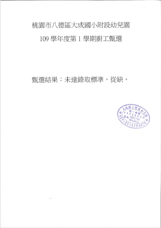 公告 大成附幼109學年度第1學期廚工甄選錄取結果