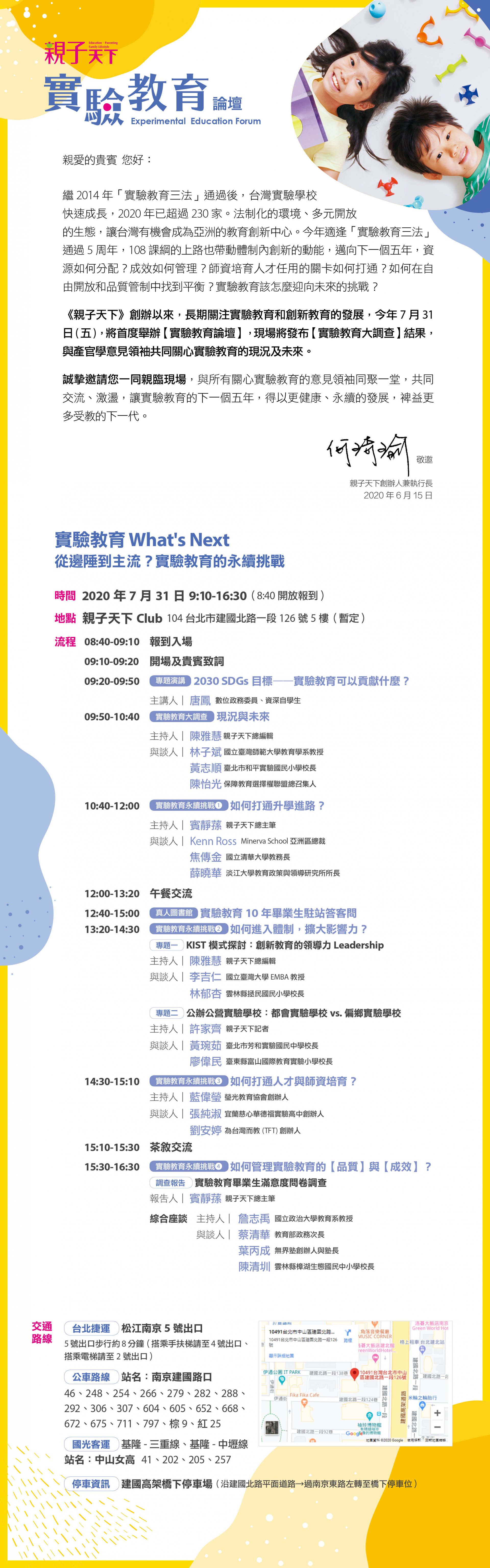 說明: 一、依據親子天下股份有限公司109年6月15日親誌字第 0020200379號函辦理。 二、親子天下為關注實驗教育與創新教育的發展,首度舉辦實驗教育論壇,活動訊息如下: (一)時間:109年7月31日(星期五)上午9時10分至下午4時30分。 (二)地點:親子天下Club(台北市中山區建國北路一段126號) (三)報名網址:https://reurl.cc/9EYQ4Y。 三、檢附來文及活動流程表各1份。