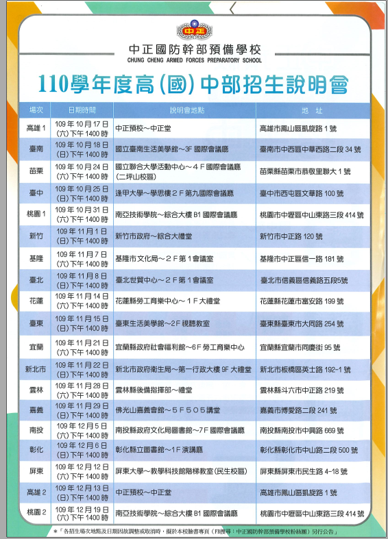 | 一、 | 依據中正國防幹部預備學校109年9月8日國預教務字第1090011536號函辦理。 |