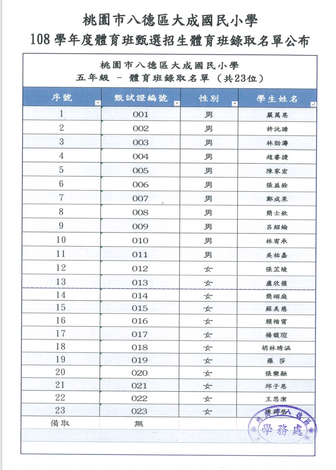 桃園市八德區大成國民小學108學年度體育班甄選招生體育班錄取名單公布