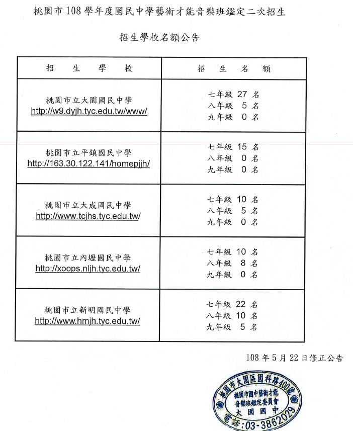 依據本市108學年度國民中學藝術才能音樂班鑑定二次招生簡章暨內壢國中108年5月21日內國輔字第1080004143號函辦理