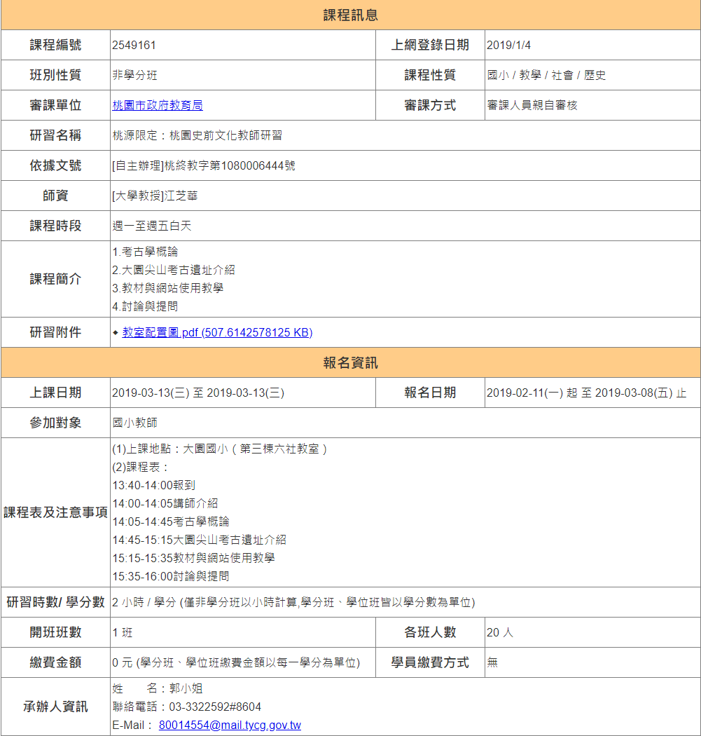 說明: 一、依文化資產保存法第12條辦理。 二、研習日期及地點:108年3月13日(星期三)下午2時至4時,大園國小六社教室。 三、報名時間:即日起至108年3月8日(星期五)前至「全國教師在職進修網」報名,人數20人。 四、因研習主題涉本市大園區文化資產--大園尖山考古遺址,請大園區各國民小學擇派教師與會。 五、全程參與者核發教師研習時數2小時,敬請學校核予參加教師公差假。